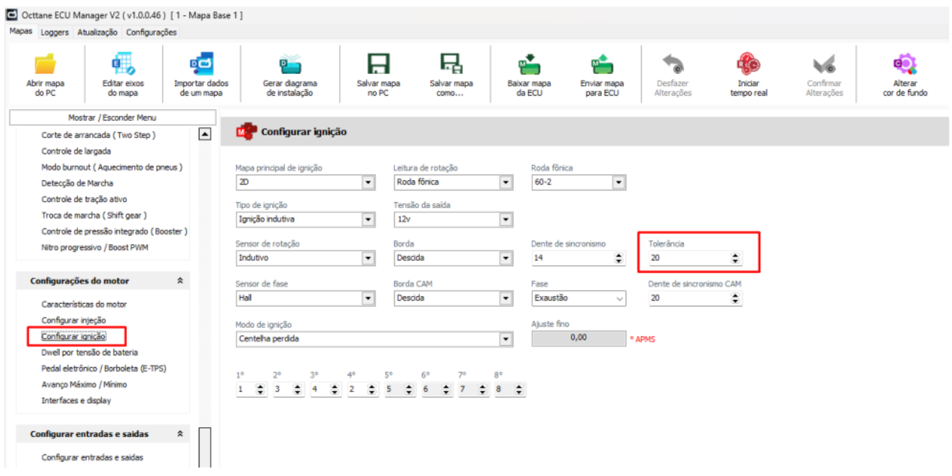 Configuração da Ignição Tolerância: 0% à 50% ( Tolerância para leitura de rotação para as falhas de dentes )