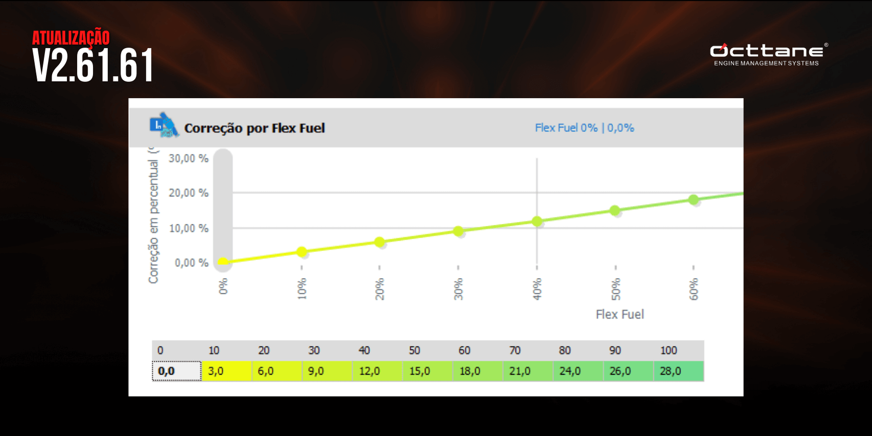 Após criar os pontos de correções por sensor Flex fuel, a Octtane começa a fazer a interpolação da leitura do sensor flex e faz as suas correções durante o funcionamento do motor, assim não precisando ficar alterando MAPA ou alterando valores de tempo de injeção e etc.