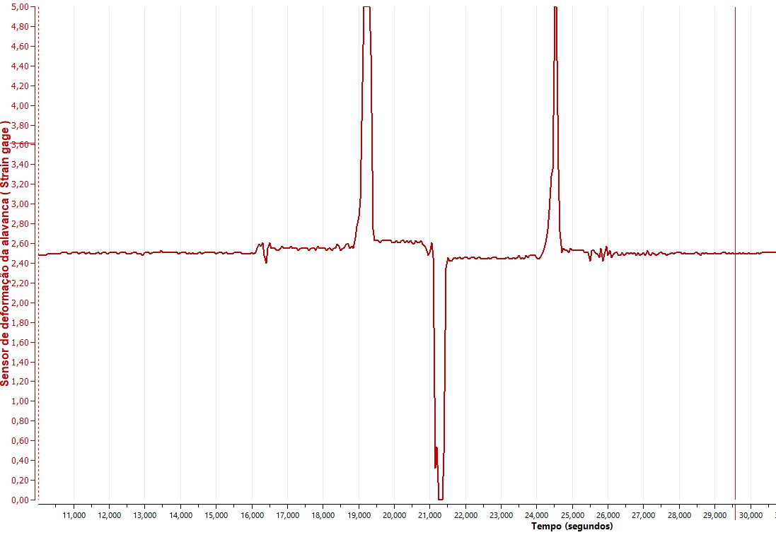 Na imagem acima, vimos que o nosso sensor strain gage esta batendo no batente com a força total aplicada na alavanca, veja que o sinal de tensão varia conforme a força aplicada.